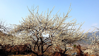 왠걸 섬진강변 골골마다 매화꽃이 만개하여 온 산에 하얀 소금을 뿌려 놓은 듯 하다.